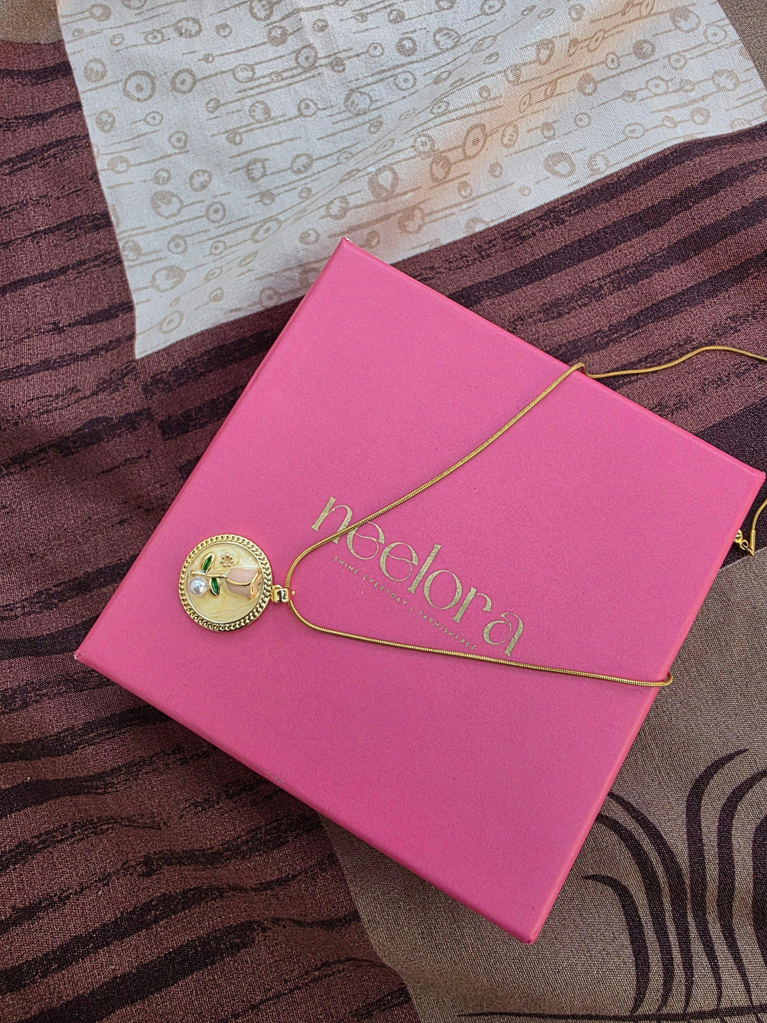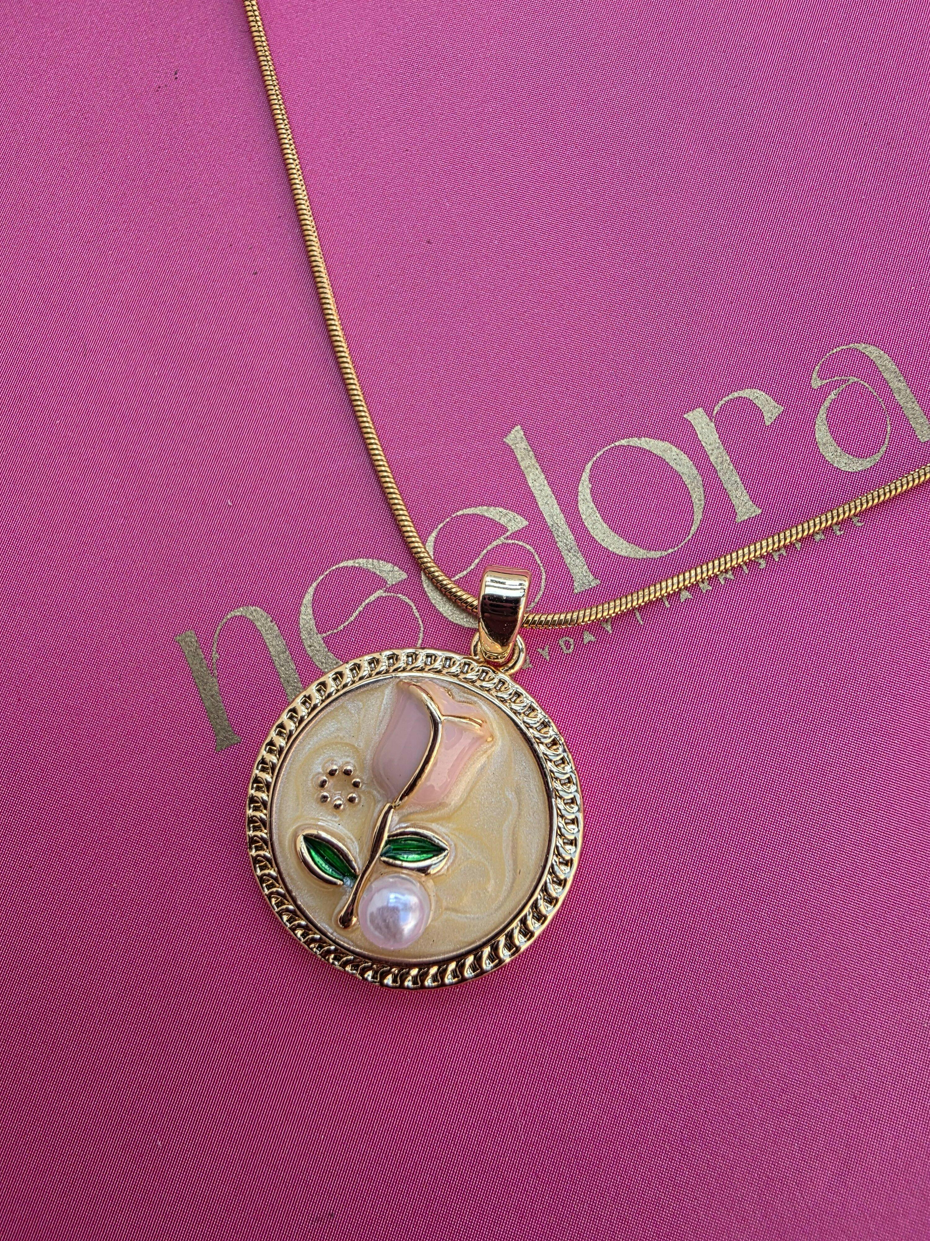 Celebrate fresh beginnings and feminine grace with the Blossom Medallion Necklace—a delicate symbol of hope and renewal. The round pendant features a softly sculpted floral motif, highlighted by a luminous pearl and touches of blush pink and green enamel, bringing a gentle elegance and joyful spirit to your look.