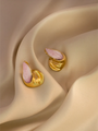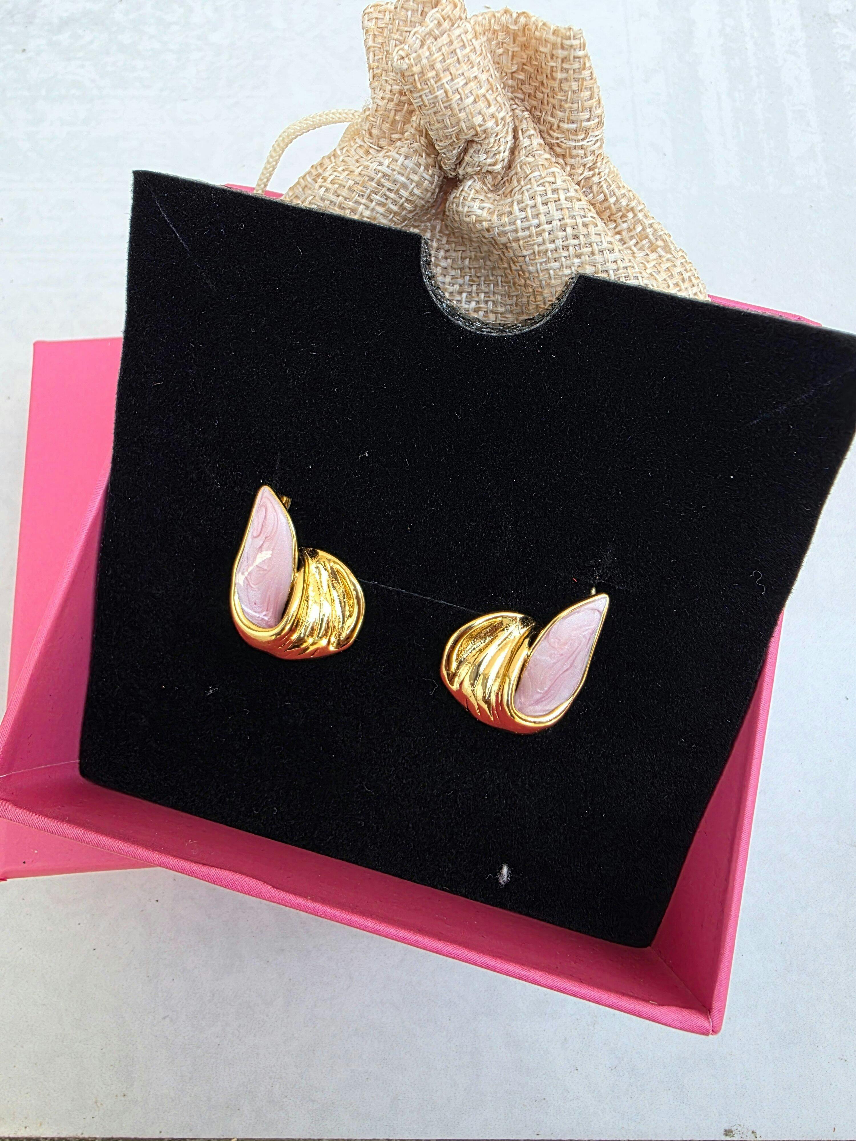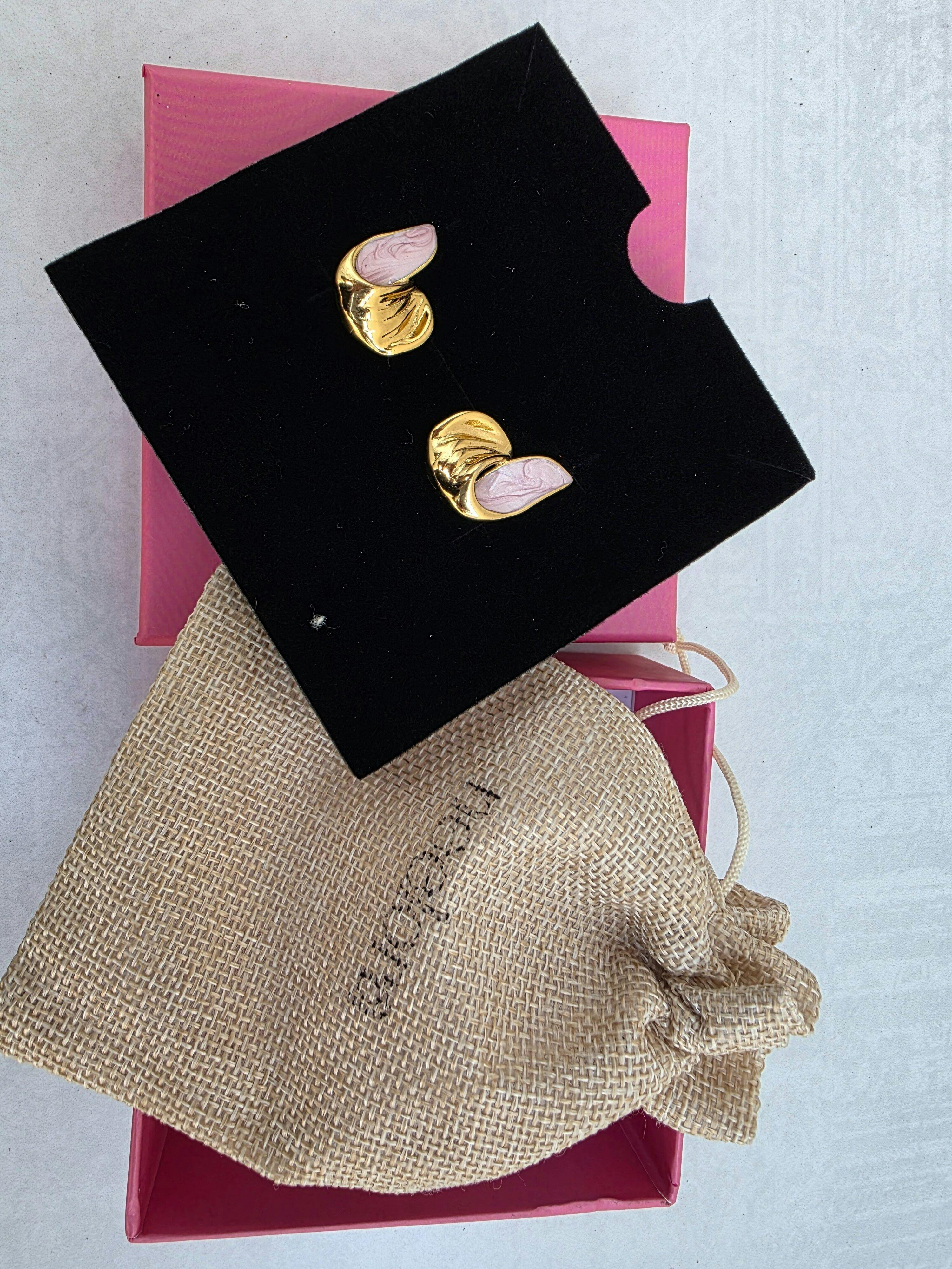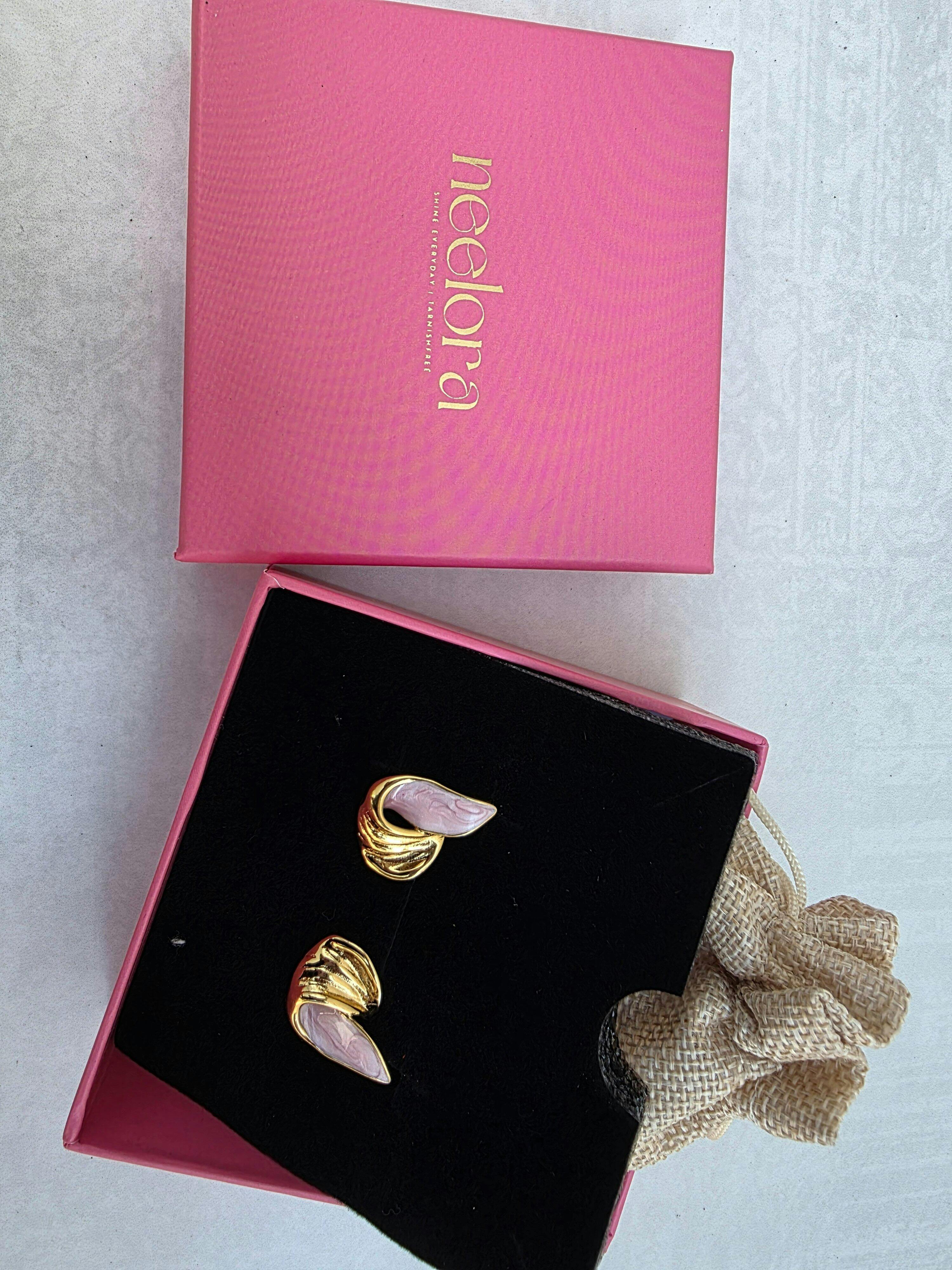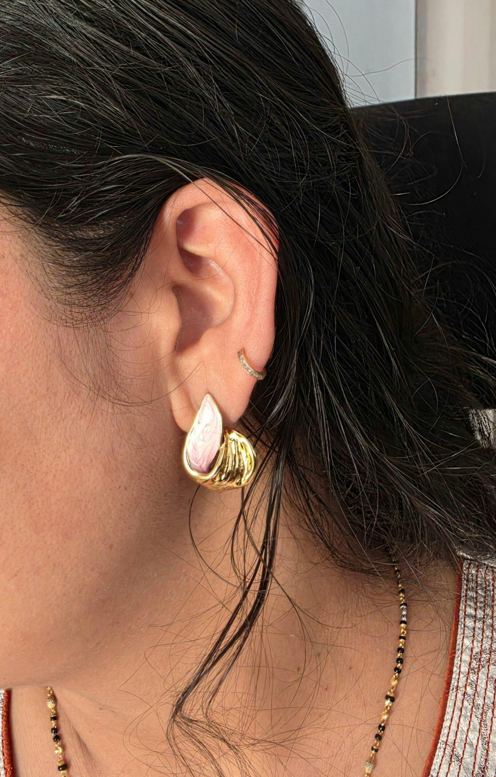 Inspired by seashells at sunrise, the Conch Shell Earrings feature a textured gold base with soft pink and white marbled enamel for a dreamy coastal look. Crafted in 18k gold-plated stainless steel, they’re tarnish-resistant, durable, and designed to shine season after season.