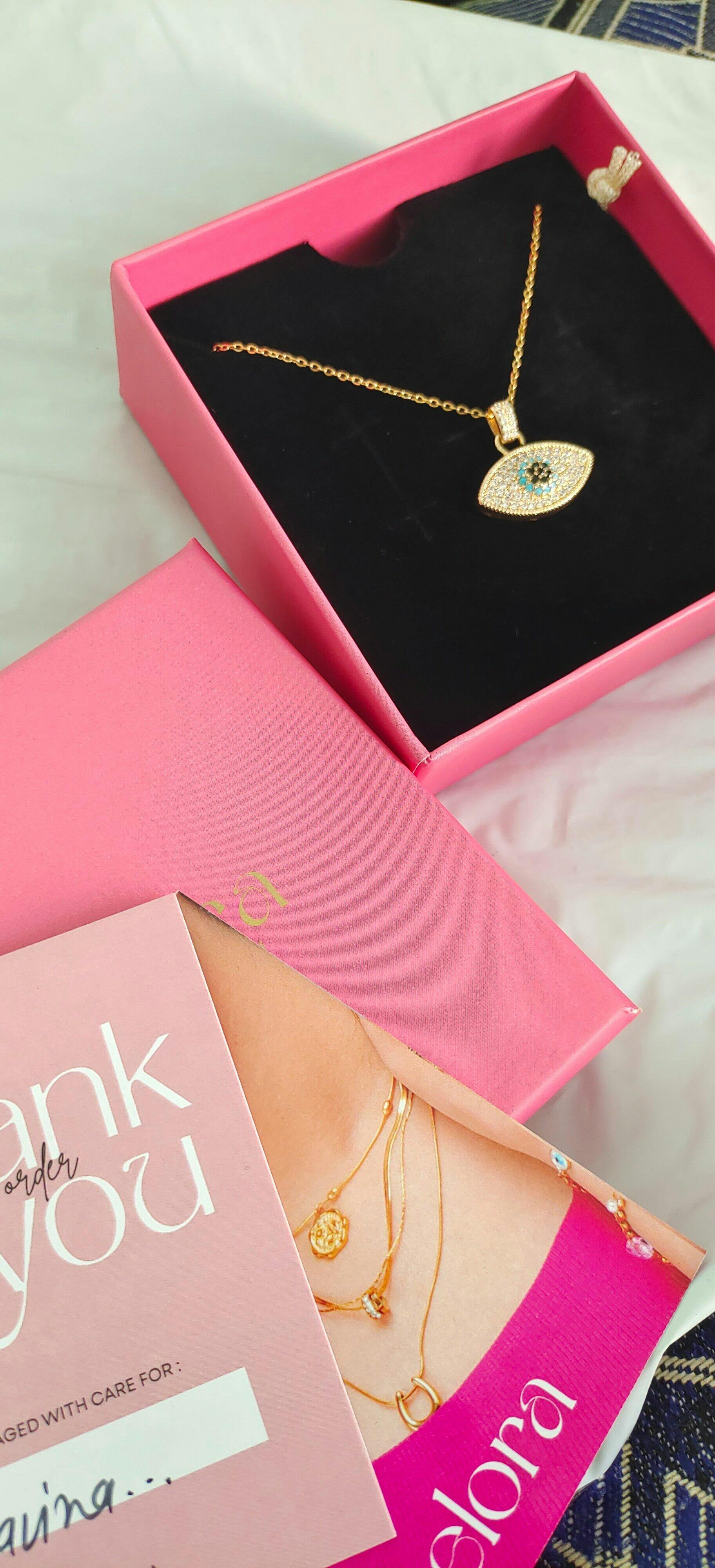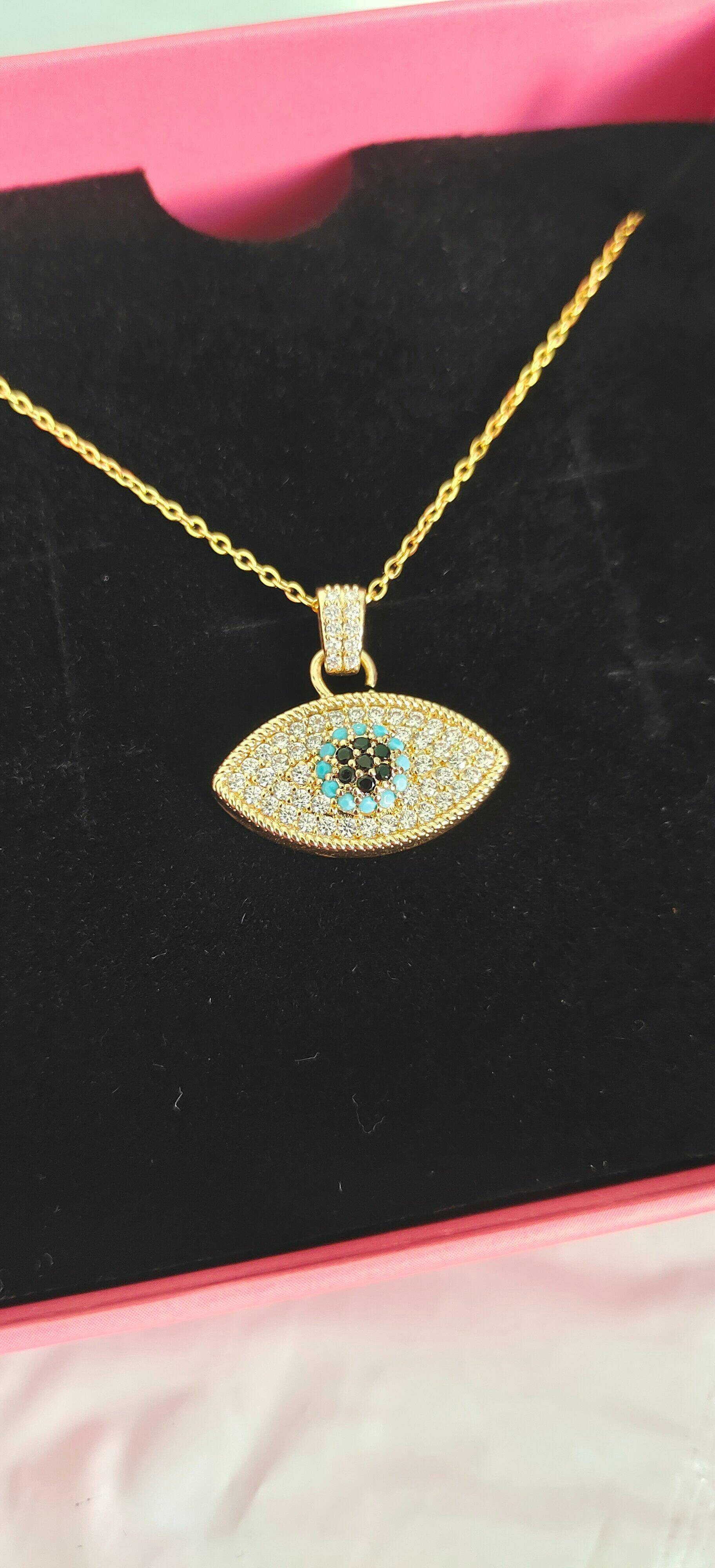 Infuse your style with radiant protection and sophisticated charm with the Crystal Eye Protection Necklace—a timeless symbol of clarity and positivity. The eye-shaped pendant glistens with pavé-set crystals, accented by mesmerizing turquoise and black stones, crafted to elevate your everyday look and safeguard your spirit