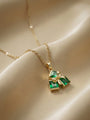 Geometric elegance meets coquette charm. This unique pendant features three emerald-cut green stones arranged in a triangle, tied together with a tiny, detailed gold bow. The deep green stones contrast beautifully with the warm gold, creating a piece that is both regal and cute.