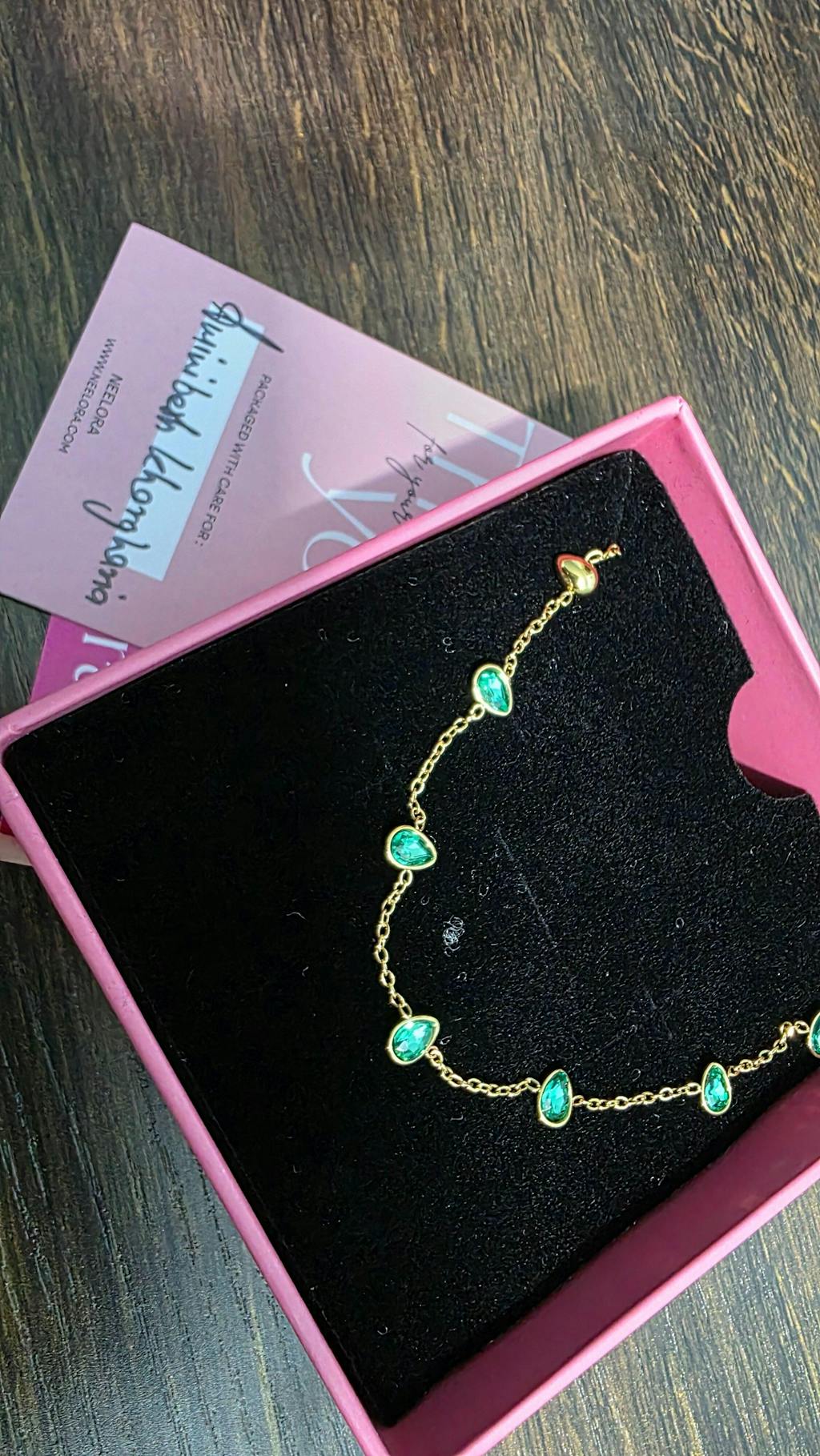 Design: Green diamond-cut teardrop stones on a minimalist chain