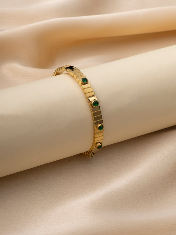Embrace modern sophistication and timeless elegance with this captivating bangle. Inspired by the sleek lines of contemporary architecture and the allure of hidden gems, this piece features a clean, gold-toned band punctuated by precisely set vibrant green stones