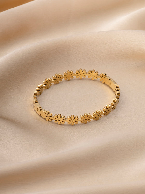 Embrace the joyous beauty of nature with this charming floral bracelet. the cheerful simplicity of a blooming daisy chain and the warmth of a sun-drenched garden, this piece features a continuous link of delicate flower motifs, some gleaming in polished gold, others subtly sparkling with central stones. It's designed to bring a touch of feminine grace and playful elegance to your wrist, perfect for those who carry a love for blossoms and a bright disposition.