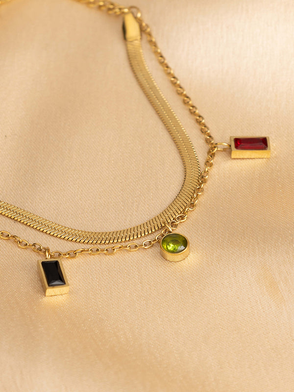 Add a pop of playful elegance to your everyday look with the Prism Luxe Charm Bracelet. This layered bracelet combines a sleek snake chain with a delicate link chain, both adorned with vibrant multi-color stone charms that catch the light with every move.
