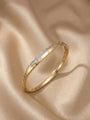 A blend of sleek design and delicate sparkle, the Radiant Curve Pave Bangle features a graceful diagonal band of shimmering crystals across a polished gold finish. The subtle engraved circle accents add a refined, designer-inspired touch to this timeless piece.